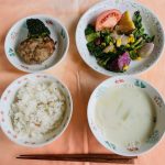 メニューは、梅干しご飯、豆乳スープ、さつまいもサラダにハンバーグ。